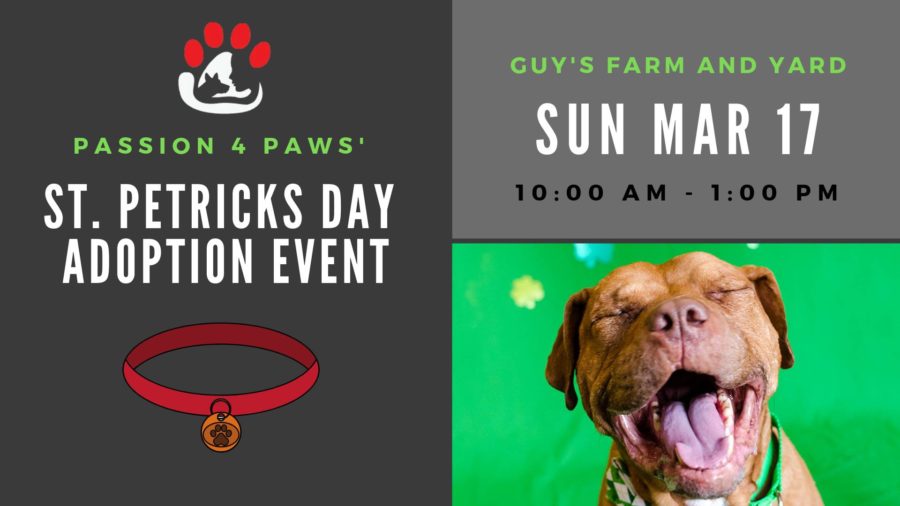 Passion 4 Paws’ Annual St Petricks Day Adoption Event will be held on Sunday, March 17th at Guy’s Farm and Yard in Williston from 10am-1pm. Please submit your adoption applications well in advance so you are pre-approved to take home your new best friend.
